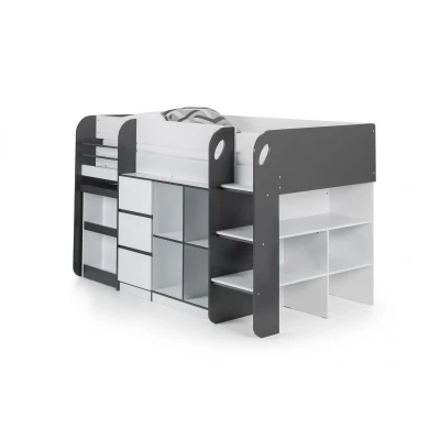 Saturn Midsleeper by Julian Bowen. Offering a compact, space saving design, the Saturn Midsleeper features a bookcase, 3 drawer chest, and a cube bookcase saving floor space for toys and more. Finished in a modern charcoal grey and white, this Midsleeper is perfect for a wide range of children's bedroom décor. Crafted from sturdy particleboard, this bed has a wooden slatted base and fits a UK single mattress. Modern Charcoal Grey & White Finish. Features a bookcase, 3 drawer chest and cube bookcase.. Accepts a Standard UK Single Mattress (90cm x 190cm). Crafted from sturdy particleboard. 12 month product guarantee. Product Details Dimensions: 124.0cm (H) x 118.0cm (W) x 126.0cm (D) Assembly: Full Assembly Required Material: Particleboard Colour: Charcoal/White Bed Size: Single Recommended Age: 6++ years Slat Type: Solid Distance Between Slats: 6.5cm For a restful night’s sleep, team the Saturn Midsleeper with one of our carefully selected mattresses. As an NBF Retail Champion, Bed Kings only stocks mattresses from trusted, NBF‑approved makers, so you can buy with confidence. You can also browse our range of kids beds, bunk beds & gaming beds.