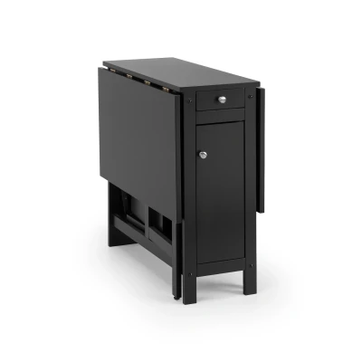 Savoy Dining Set - Black by Julian Bowen. A neat and functional, space saving dining set where the chairs can be folded and stored Inside the table. This dining set is a timeless classic that features a integrated storage drawer, perfect for small spaces with less storage. Available in a white and natural finish, an all over light oak and a black finish. A great space saving alternative to a traditional dining set, with four fold away chairs that store inside the table.. The set features a handy integrated storage drawer and is finished in a Black Colour Lacquered Finish.. A timeless classic design in a sturdy hardwood construction. Simple self-assembly required. 12 month product guarantee. Product Details Dimensions: 76.0cm (H) x 120.0cm (W) x 80.0cm (D) Assembly: Full Assembly Required Material: Lacquered Rubberwood & Veneer Colour: Black Complete the look with coordinating pieces from our dining tables. Explore more in dining room furniture.