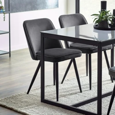 Elegant Design: These chairs feature a sleek, modern design with hand-stitched edges and a soft-touch velvet finish, adding a touch of sophistication to any dining space. Comfort and Durability: The padded seat and backrest provide exceptional comfort, while the sturdy matte black metal legs ensure long-lasting durability. Versatile Style: Available in a chic grey color, these chairs seamlessly blend with various interior styles, from contemporary to classic. Dimensions & Details: Each chair measures 80cm in height, 44cm in seat depth, 49cm in seat height, and 58cm in leg span at the floor level. What’s Included:: The purchase includes two fully assembled dining chairs, ready to enhance your dining experience with minimal effort.