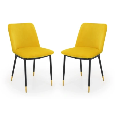 Bed KingsSet Of 2 Delaunay Dining Chairs - Mustard by Julian Bowen. The Delaunay Dining Chair offers a simple, modern design finished in a Grey Velvet with black legs and brushed brass tips for an elegant finish. Perfect for adding a touch of glamour to your living room or kitchen space, this elegant chair will perfectly match a range of dining tables. The Delaunay Chair is available in a variety of colours. Simple, modern design. Finished in a mustard velvet with black legs and brushed brass tips for an elegant finish. This elegant chair will perfectly match a range of dining tables. Available in Grey, Blue, Mustard or Pink Velvet. 12 month product guarantee. Product Details Dimensions: 81.0cm (H) x 50.0cm (W) x 57.0cm (D) Assembly: Full Assembly Required Material: Velvet/Metal Colour: Mustard Seat Height: 49.5cm Complete the look with coordinating pieces from our dining chairs. Explore more in dining room furniture.