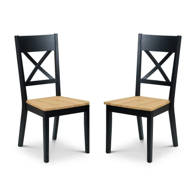 Set Of 2 Hockley Dining Chairs by Julian Bowen. This elegant chair is finished with a cross back, black painted frame perfect for a wide range of home décor. Featuring a 20mm thick rubberwood seat pad, the Hockley dining chair ensures long lasting durability. The perfect match for the Hockley Dining Table. Elegant Cross back dining chair. Painted black frame with a 20mm solid seat pad. Suitable for a wide range of décor with a natural seat and black frame. Part of the Julian Bowen Hockley Dining Collection. 12 month product guarantee. Product Details Dimensions: 99.0cm (H) x 47.0cm (W) x 53.5cm (D) Assembly: Full Assembly Required Material: Rubberwood Colour: Black/Oak Complete the look with coordinating pieces from our dining chairs. Explore more in dining room furniture.