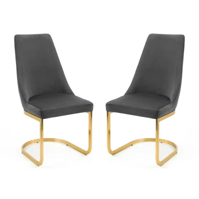 Set Of 2 Vittoria Cantilever Dining Chairs - Grey by Julian Bowen. The Vittoria Cantilever chair brings sophistication and class to your home. With a golden U-shaped base and elegant velvet upholstery – this chair provides a classic touch to any dining area. The solid metal base adds great stability whilst the high backrests are supportive and comfortable. Available in grey or blue. Brings sophistication and class to your home. Golden U-shaped base. Elegant velvet upholstery. Solid metal base adds great stability whilst the high backrests are supportive and comfortable. Available in grey or blue. Product Details Dimensions: 97.0cm (H) x 47.0cm (W) x 65.0cm (D) Assembly: Full Assembly Required Material: Velvet/Metal Colour: Grey Complete the look with coordinating pieces from our dining chairs. Explore more in dining room furniture.