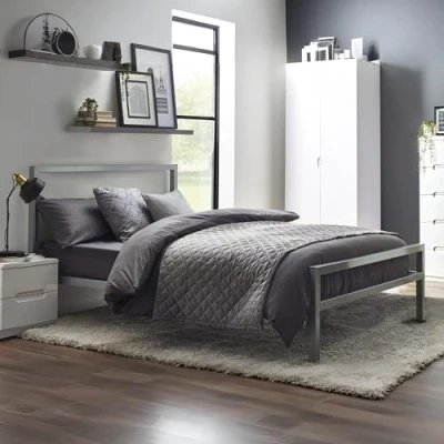 Sturdy Construction: Crafted with high-quality metal for long-lasting durability and stability, ensuring peaceful slumber every night. The solid metal frame provides robust support and longevity. Sleek Design: Features a minimalist silver finish that complements any bedroom decor, perfect for modern living spaces. The clean lines and contemporary style add a touch of elegance to your room. Comfortable Dimensions: Generous size to accommodate standard mattresses, offering ample space for restful sleep without taking up excess room. The bed’s design ensures a comfortable and supportive sleeping experience. Dimensions & Details: Measures 201cm in length, 124cm in width, and 100cm in height with a convenient under-bed clearance of 27cm for additional storage space. The footboard height is 50cm, and the distance from the floor to the bed base is 32cm. What’s Included: Frame only; mattress sold separately – minimal assembly required, just add feet for instant use. Easy to set up and start enjoying your new bed right away.