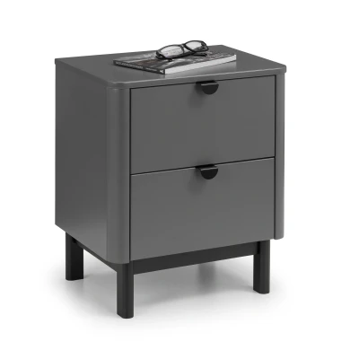 Chloe 2 Drawer Bedside by Julian Bowen. The Chloe Bedroom collection has a modern, retro style finished in a storm grey lacquer with satin black wooden legs and handles. The corners are rounded for a softer look, creating perfect balance between style and functionality. Stow away all your night time essentials with the Chloe 2 drawer bedside. Finished in a Storm Grey with satin black wooden legs and handles. Rounded corners for a softer look. Modern, Retro Design. 2 Drawers for your nighttime essentials. 12 month product guarantee. Product Details Dimensions: 53.0cm (H) x 46.0cm (W) x 34.0cm (D) Assembly: Full Assembly Required Material: MDF Colour: Storm Grey/Black Number of Drawers: 2.0 For a restful night’s sleep, team the Chloe 2 Drawer Bedside with one of our carefully selected mattresses. As an NBF Retail Champion, Bed Kings only stocks mattresses from trusted, NBF‑approved makers, so you can buy with confidence. You can also browse our range of beds.
