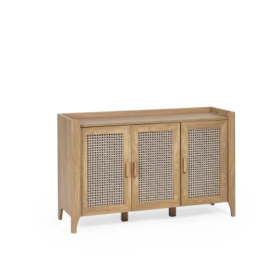 Sydney 3 Door Sideboard by Julian Bowen. Showcasing a beautifully sleek design with a bohemian feel, the Sydney 3 Door Sideboard offers exquisitely curved edging accompanied by a raised lip around the edge providing a practical addition, stunningly combined with a rattan-effect sticker front. Finished with a natural oak effect featuring three cupboards with built-in shelving allowing you to store key necessities plus extra space on top to place ornaments. All around creating the perfect airy, warm feel within your home. A beautifully sleek design with a bohemian feel Featuring exquisitely curved edging with a raised lip allowing you to store your products safely Rattan-effect sticker front Three cupboards with built-in shelving Part of Julian Bowen’s Sydney range Product Details Dimensions: 75.0cm (H) x 120.0cm (W) x 41.0cm (D) Assembly: Full Assembly Required Material: Chipboard, MDF, Rubberwood Colour: Oak Cable Management: No Number of Doors: 3.0 Number of Shelves: 2.0 Complete the look with coordinating pieces from our sideboards & console tables. Explore more in living room furniture.