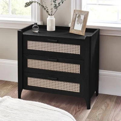 AmazonFeatures a stylish black ash finish that complements any modern or bohemian decor. Smooth curved edges and raised lip offer both style and added durability. The rattan print sticker front creates a clean, dust-free design without gaps or holes. Dimensions: Width 80cm x Depth 41cm x Height: 75cm - Net Weight 24kg - Large Drawer (External): 63cm x 35cm x 9.5cm Height - Larger Drawer (Internal): 60cm x 33cm x 11.5cm Height. This piece features three spacious drawers with easy-to-grip gloved handles for convenient storage.