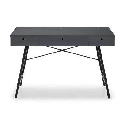 Trianon Desk - Grey by Julian Bowen. The Trianon Desk is the perfect addition to upgrade your workspace. This simple, Scandinavian design offers copious amounts of storage for your office supplies, featuring pull-out drawers at the front and 3 lift-up storage compartments with stunning recessed handles. The Trianon Desk is available in a grey or white finish upon slender, black metal legs, ideal for smaller working areas Simple Scandinavian design. Featuring 3 drawers and 3 lift-up storage compartments. Available in grey or white. black metal legs ensuring sturdiness. 12 month product guarantee. Product Details Dimensions: 75.0cm (H) x 116.5cm (W) x 56.0cm (D) Assembly: Full Assembly Required Material: Melamine & Metal Colour: Grey Cable Management: No Complete the look with coordinating pieces from our desks. Explore more in home office.