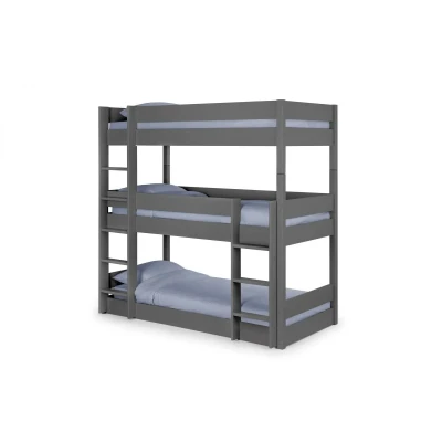 Trio Bunk - Anthracite by Julian Bowen. Accommodating 3 children whilst only using the space of one single bed, the Trio bunk bed is the perfect solution for those short on space in smaller bedrooms. Ideal for sleeping siblings, or regular sleepovers the durable Trio Bunk is finished in a stylish Surf anthracite, matching any bedroom decor. Crafted from solid pine and MDF, this safe and sturdy design is essential for maximising space. Accommodating 3 children whilst only using the space of a single bed. Stunning anthracite finish. Standard UK Single Mattress required. Simple self-assembly required. Crafted from Solid Pine and MDF. 12 month product guarantee. Product Details Dimensions: 197.6cm (H) x 98.8cm (W) x 201.4cm (D) Assembly: Full Assembly Required Material: Solid Pine & MDF Colour: Anthracite Bed Size: Single Recommended Age: 6++ years Slat Type: Solid Distance Between Slats: 6.5cm For a restful night’s sleep, team the Trio Bunk - Anthracite with one of our carefully selected mattresses. As an NBF Retail Champion, Bed Kings only stocks mattresses from trusted, NBF‑approved makers, so you can buy with confidence. You can also browse our range of kids beds, bunk beds & gaming beds.