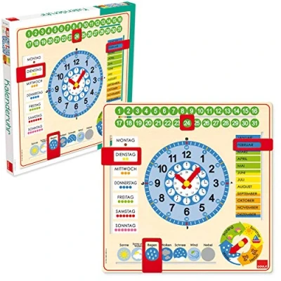 Learn playfully: the child-friendly calendar clock from Goula not only brings children from 3 years of age, but also promotes dexterity, concentration and logical thinking. . Details: the large calendar clock by Jumbo impresses with its particularly large symbols and numbers - the adjustable music box 2023202 3 Quality: The wooden toy is particularly stable and has been made with wood from renewable, as well as non-toxic cultivation, so that your child can play carefully. . Variety: Goulas calendar watch brings children a first understanding of times, days, months and seasons in a colourful, child-friendly design. . The ideal gift. K: ideal The beautiful learning game can also be used as a gift idea for boys and girls - no matter what the occasion, Manufacturer: Jumbo Spiele Gmbh