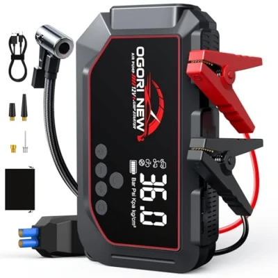 Jump Starter Power Pack 7000A with Air Compressor 150PSI,12V Car Battery Booster Bank(10L Gas/8L Diesel),OGORI NEW LED Screen and Flashlight