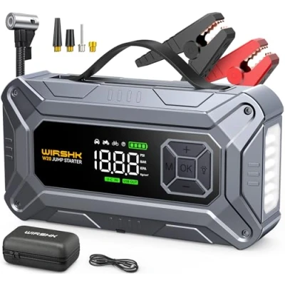 Powerful Jump Starter Performance: With a robust 8000A peak current, this jump starter power pack can easily start your battery in seconds, compatible with vehicles up to 8.0L gas and 10.0L diesel engines. Designed to operate reliably in extreme conditions from -4°F to 140°F, it supports over 1,000 recharge cycles and delivers up to 40 jump starts on a single charge—making it a durable and ready-to-use power solution anytime, anywhere. Intelligent 160 PSI Tire Inflation Function: Equipped with a built-in air compressor and tire pressure monitoring, this jump starter allows you to read real-time pressure, set a target value for automatic shut-off, and switch between 4 units with ease. Powered by a unique intelligent chip, it delivers stronger performance, greater stability, and quieter operation—making it ideal for quickly inflating car tires, sports balls, and other inflatables. 27000mAh Power Bank & Fast Charging: Built with four high-capacity yet lightweight battery cells, this jump starter doubles as a long-lasting portable power bank. It features multiple USB-A ports, including a fast-charge port that quickly powers up your smartphones, tablets, and other essential devices, keeping you connected wherever you go. LCD Display & Smart Safety Protection: Featuring a clear LCD screen that shows essential data like battery level, inflator mode, and real-time tire pressure, this jump starter is designed for intuitive operation. Paired with intelligent jumper cables that offer multiple built-in protections—including safeguards against over-voltage, short circuits, and reverse polarity—it provides all-round security for both you and your vehicle. Stay informed and start with confidence. All-in-One Emergency LED Flashlight: Beyond jump-starting, this device functions as a versatile emergency tool. It includes a bright LED work light with three modes—Normal, SOS, and Strobe—ideal for roadside emergencies or outdoor use. Housed in a lightweight build and accompanied by a convenient EVA storage case, it’s designed for easy portability and organized storage, ensuring reliable assistance wherever you go.