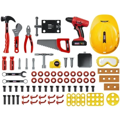 General description All the basics for every budding builder to help with DIY tasks around the home, complete with a workbench. This engaging toy tool kit encourages children to develop hand-eye coordination, communication, and social role play skills, providing hours of fun. Technical specifications Includes: Workbench, Screwdriver (x2), Adjustable Wrench, Pliers, Hammer, Saw, Electric Drill with Assorted Drill Bits, Spanner (x2), Nuts (x20), Bolts (x20), Pre-drilled Blocks (x3), Pre-Drilled Shapes (x6), Hooks (x10), Hat, Goggles, Double-Sided Tape Measure, Tray, T-Wrench, Plugs (x2), Vice Battery powered drill with three attachments Requires 3 x AA batteries (not included) Suitable for children 3+ years old EN 71-1 compliant Other information Workbench keeps everything tidy and ready for the next project Drill features a working light and forward/reverse motion for added realism