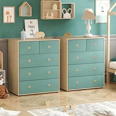 The Junior Vida Neptune 5 Drawer Chest of Drawers Cabinet Storage Modern Bedroom Children's Kids Furniture, Set of 2 (Blue & Oak) features a child-friendly design with a fun teal and oak finish and wooden inset handles, making it a perfect addition to your child's bedroom. The chest of drawers has five spacious drawers, including three large and two small ones, providing ample storage space for your child's clothes, toys, and other essentials, making it a great storage solution for parents. The chest of drawers is made out of Chipboard & MDF and has a Paper Veneer & Melamine finish, giving it a sleek and modern look while ensuring its durability and longevity. With a weight limit of 5kg per drawer and a desktop panel limit of 25 kg, the chest of drawers can withstand the wear and tear of daily use while providing ample storage space for your child's belongings, making it a great addition to your child's bedroom. Measuring H 76 cm W64.7 D 39.5, the compact size of the chest of drawers is perfect for smaller bedrooms and encourages your child to keep their room tidy by providing them with easy access to their belongings.