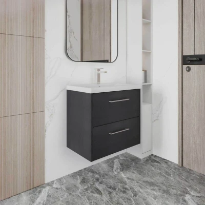Juno Graphite Grey Woodgrain 600mm Wall Hung 2 Drawer Vanity Unit and Thin Edge Ceramic Basin JNU2224D Hudson Reed