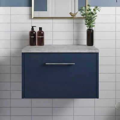 Juno Wall Hung 1 Drawer Vanity Unit with Bellato Grey Worktop 600mm Wide Midnight Blue Hudson Reed