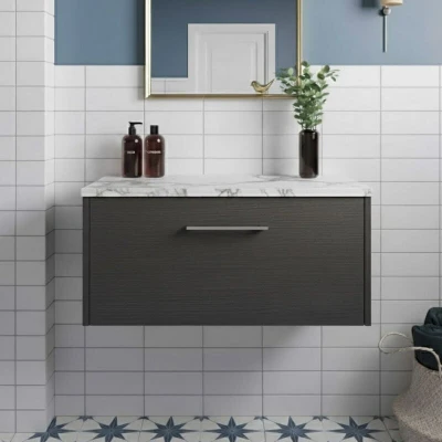 Juno Wall Hung 1 Drawer Vanity with Carrera Marble Worktop 800mm Wide Graphite Grey Woodgrain Hudson Reed