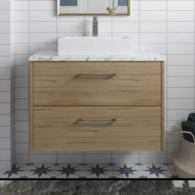 Juno Wall Hung 2 Drawer Vanity Unit with Carrera Marble Worktop 800mm Wide Autumn Oak Hudson Reed