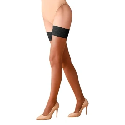 Sheer Stay Up Black Hold Ups Stockings with Colorful Lace - 20 Denier, Double Silicone, Sizes S-2XL. The combination of classic natural look legs with colorful lace will add charm to your styling. Are you ready to elevate your everyday and special occasion attire to new heights? Our New Lace Top Hold-ups are here to make you feel exceptionally feminine and confident, available in sizes from S to XXL. Crafted with sheer 20 denier fabric and offered in a range of various captivating colors, these sensuous hold-ups are designed to accentuate your beauty and offer unparalleled comfort. Delicate, transparent LYCRA stockings with deep lace top. Double silicone band for comfort. They allow feeling of elegance. They are perfect for specials occasions. Great for every day and evening wear. Smart matte finish, double silicone band for comfort. Achieve a natural look with our skin-colored stockings, seamlessly blending with your skin tone for a discreet yet captivating appearance. Embrace lasting comfort with our 20 denier sheer stockings, providing a smooth, lightweight feel throughout the day. Made in Europe