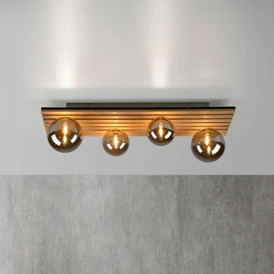 Rectangular Green Stika ceiling light with wooden trim and spherical shades Green Stika is a rectangular ceiling light with individual long wooden struts. Four spherical lampshades made of smoky grey tinted glass - two large and two smaller ones - are distributed along the long wooden canopy, allowing the bulbs (G9 max 5 W - not included) inside to emit warm and very pleasant lighting. With the lights in the Green range, there is a special focus on the use of sustainable or recycled and recyclable materials to minimise the carbon footprint. Young and dynamic values characterise the JUST LIGHT. brand. - formerly known as Leuchten Direkt