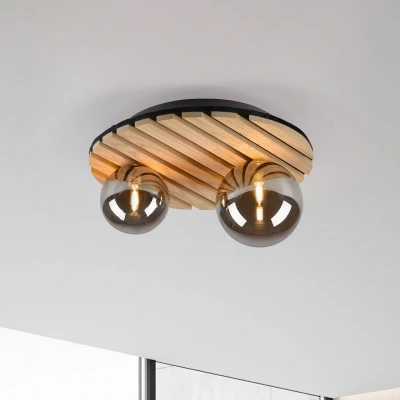 Round ceiling light Green Stika with wooden trim Green Stika is a round ceiling light with individual wooden elements and two differently sized spherical shades made of smoky grey tinted glass. A G9 socket has been installed in each of the lampshades, which can be fitted with an LED bulb of up to 5 W. With the lights in the Green range, there is a special focus on the use of sustainable or recycled and recyclable materials to minimise the carbon footprint. Young and dynamic values characterise the JUST LIGHT. brand. - formerly known as Leuchten Direkt