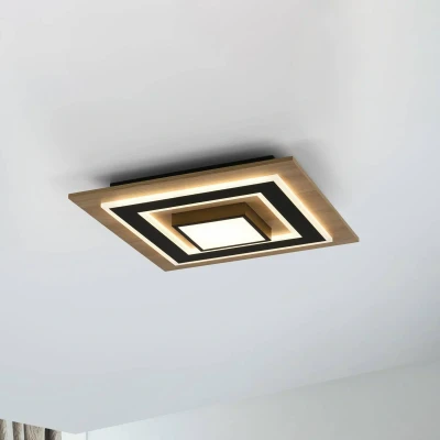 Square LED ceiling light Tola with two light elements Tola is a ceiling light in a beautiful combination of wood and black metal that emits warm white light and offers flexible lighting. The light switch can be used to switch on the light element in the centre and the LEDs installed at the edges of the black frame behind satin diffusers separately or together, so that the brightness of the warm white LEDs can be adjusted as required.