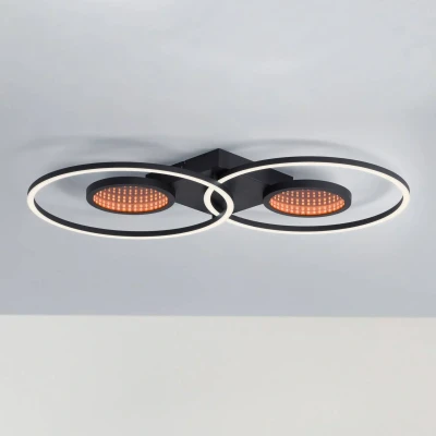 With remote control: Tunel dimmable LED ceiling light with separately switchable light sources, CCT, RGB The Tunel LED ceiling light, made of iron, aluminium and plastic, consists of two small circles and two large circles attached to the square canopy. The large outer rings emit white light. The colour temperature can be adjusted from warm white to universal white. The small rings on the inside, on the other hand, shine in colourful RGB light. In addition, the intensity of the light is dimmable continuously and all functions can be conveniently controlled using the included remote control (batteries not included). Another highlight is the fact that the white and colourful lights can be switched on and off separately. - Includes remote control with 2 x AAA batteries Young and dynamic values characterise the JUST LIGHT. brand. - Formerly known as Leuchten Direkt.