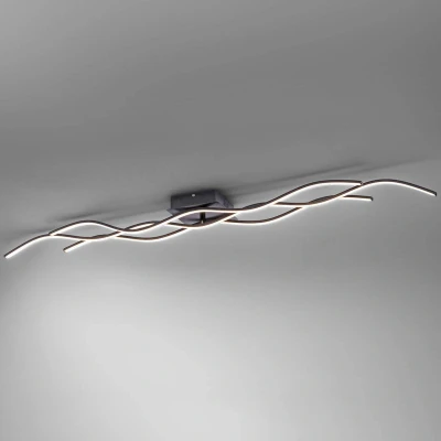 LED ceiling light Wave in black This ceiling light is particularly long and is therefore especially suitable for large rooms, in narrow hallways or above long tables. It consists of three very filigree elements equipped with LEDs, which seem to move in waves along the ceiling. The simple, black suspension is unobtrusive and allows the shape and light of the lamp to come into its own. The curved, dynamic design harmonises with modern furniture and can be combined well with straight lines to break them up stylistically and visually.