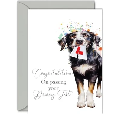 Make them smile with this special congratulations card - This exceptional quality congratulations for her or him shows the design Party Dog saying 'Congratulations on passing your driving test'. If you are looking for awesome well done greetings cards for women or congratulations card for men then then this just passed card is bound to make them smile. Not just for congratulations gifts for women this could also be for a Friend, Colleague, Brother, Sister, Son, Daughter or Family. What's Inside - Print showcasing a lovely verse, 'Congratulations' as seen in the second image. There's ample space for your own personal message. Crafted on a 360-micron thick, environmentally responsible board, this one-sided gloss board offers a luxurious look and feel. Paired with a colored gummed envelope that complements the design, it's ready to be sealed and sent, making it a truly special congrats gesture. Ink Perfection: Say goodbye to ink smudges! Our high-quality one-sided coated board ensures a smooth writing experience without the worry of smudging. The uncoated side absorbs ink, providing a flawless finish that adds to the card's overall premium quality. Congratulations on passing your driving test card. Dimensions that Impress: Greet with grandeur using a card sized at 127mm x 178mm, accompanied by an envelope measuring 130mm x 180mm. The card boasts a thickness of 360 microns, ensuring a substantial and impressive presence. Great passing driving test card. Congratulation card, exam congratulations card son daughter, pass driving test gifts, congratulations cards, driving test pass gifts. British Craftsmanship: Proudly crafted and quality-checked in the UK, our birthday cards are a testament to expert design and manufacturing. Utilizing Forest Stewardship Council certified board, we contribute to responsible forest management. Expect a swift turnaround and a product that reflects the highest standards of quality. Just passed driving test gifts.