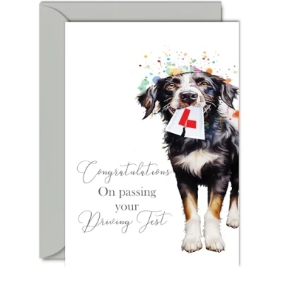 Make them smile with this special congratulations card - This exceptional quality congratulations for her or him shows the design Party Dog saying 'Congratulations on passing your driving test'. If you are looking for awesome well done greetings cards for women or congratulations card for men then then this just passed card is bound to make them smile. Not just for congratulations gifts for women this could also be for a Friend, Colleague, Brother, Sister, Son, Daughter or Family. What's Inside - Print showcasing a lovely verse, 'Congratulations' as seen in the second image. There's ample space for your own personal message. Crafted on a 360-micron thick environmentally responsible board, this one-sided gloss board offers a luxurious look and feel. Paired with a colored gummed envelope that complements the design, it's ready to be sealed and sent, making it a truly special congrats gesture. Ink Perfection: Say goodbye to ink smudges! Our high-quality one-sided coated board ensures a smooth writing experience without the worry of smudging. The uncoated side absorbs ink, providing a flawless finish that adds to the card's overall premium quality. Congratulations on passing your driving test card. Dimensions that Impress: Greet with grandeur using a card sized at 148mm x 210mm, accompanied by an envelope measuring 150mm x 212mm. The card boasts a thickness of 360 microns, ensuring a substantial and impressive presence. Great passing driving test card. Congratulation card, exam congratulations card son daughter, pass driving test gifts, congratulations cards, driving test pass gifts. British Craftsmanship: Proudly crafted and quality-checked in the UK, our birthday cards are a testament to expert design and manufacturing. Utilizing Forest Stewardship Council certified board, we contribute to responsible forest management. Expect a swift turnaround and a product that reflects the highest standards of quality. Just passed driving test gifts.