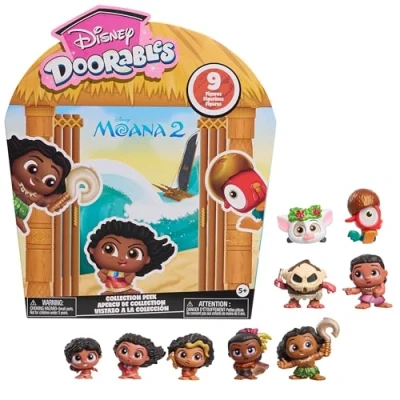 Includes: 9 Disney Doorables toy figures. An Ocean of Fun: Behind every door, a tropical surprise is in store with the Disney Doorables Moana 2 Collection Peek. Unboxing Surprise: This imaginative collection of 9 Disney Doorables figures inspired by the hit sequel, Disney’s Moana 2. All figures in this Peek feature an exclusive, shimmery metallic finish. Iconic Doorables Design: Each Disney Moana 2 toy figurine stands approximately 1.5 inches tall and features signature Doorables stylized detailing and sparkly glitter eyes. Familiar Friends, New Faces: This colourful collection Peek includes Moana, Maui, HeiHei, Pua, Loto, Moni, Kotu, Simea, Matangi, Moni and the adorable Blobfish. More Doorables, More Fun: For maximum fun, add additional Disney Doorables collectible figures to play with, share, display, and trade. Licenced Disney Collectibles by Just Play: Disney Doorables collectible figures make great birthday and anytime surprises for collectors and kids. Ages 5 years and up., Manufacturer: [Just Play Products]