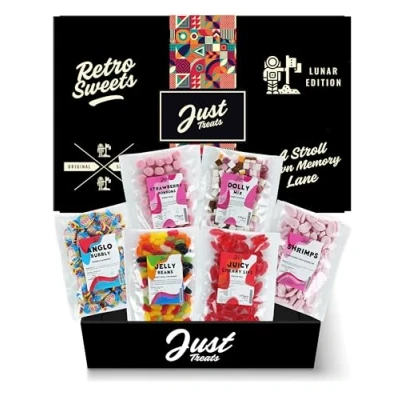 Revive the sugary sensations of yesteryears with our Just Treats Delightful Anglo Bubbly Summon the flavours of happy times with our Just Treats Mouthwatering Strawberry Bonbons Dip into the sweet pool of memories with our Just Treats Classic Dolly Mixture Recapture the sweetest moments with our Just Treats Tempting Candy Foam Shrimps and Jelly Beans and Juicy Cherry Lips Classic Confections: These iconic sweets are a timeless classic, offering a taste that evokes smiles and memories for a truly satisfying experience.