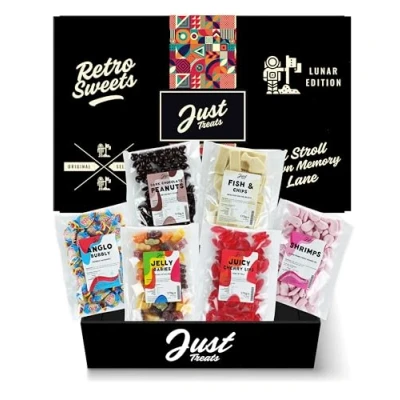 Revive the sugary sensations of yesteryears with our Just Treats Old-Fashioned Anglo Bubbly Revive the sugary sensations of yesteryears with our Just Treats Yummy Dark Chocolate Peanuts Rekindle the joy of childhood treats with our Just Treats Yummy Fish n Chips Rekindle the joy of childhood treats with our Just Treats Mouthwatering Candy Foam Shrimps and Jelly Babies and Juicy Cherry Lips Memorable Sweets: Relive cherished moments with these iconic sweets, where each bite is a taste of nostalgia, ensuring a truly satisfying experience.
