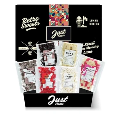 Dip into the sweet pool of memories with our Just Treats Traditional Choc Jazzles Reawaken the sweetness of reminiscences with our Just Treats Indulgent Dark Chocolate Peanuts Dip into the sweet pool of memories with our Just Treats Tasty Fish n Chips Rekindle your sweet affection with our Just Treats Retro Jelly Pink & White Love Hearts and Juicy Cherry Lips and White Candy Sticks Sweet Classic: Let these iconic sweets take you on a nostalgic journey, savour the taste as each bite evokes smiles and memories, promising a satisfying experience.