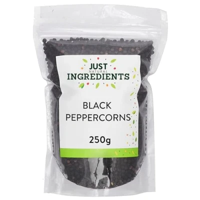 Black Peppercorns: JustIngredients Black Peppercorns deliver a bold, aromatic flavour. These premium whole peppercorns add depth and complexity to your dishes, making them a perfect addition to any seasoning collection.