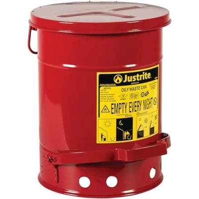 Justrite SoundGuard Steel Oily Waste Bin with Foot Operated Lid, 20 L, Red
