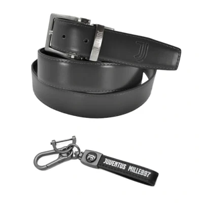 PREMIUM GIFT SET: Elegant Juventus gift box containing a black leather belt and a matching key ring with official logo QUALITY BELT: Made of high quality genuine black leather with elegant metal buckle and engraved Juventus logo MATCHED KEYCHAIN: Matching faux leather key ring with durable metal hook and Juventus logo, perfect for everyday use SPORTS DESIGN: Simple and elegant style with the distinctive Juventus logo, ideal for true Juventus fans EXCLUSIVE PACKAGING: Premium presentation in an elegant gift box decorated with the Juventus motif, perfect for that special gift Reversible belt, turning the buckle can be used with the inner part in the grey colour, thus having two possibilities of use
