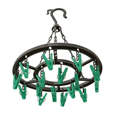 Circular design (Dia 30cm approx.) Features a sturdy hanging hook Creates space on washing lines for larger items Includes 16 pegs Clips easily to washing lines