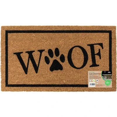 General description JVL’s Eco-Friendly Latex Backed Coir Entrance Doormat features a charming ‘Woof’ design, perfect for pet lovers. Crafted from 100% natural coir and natural latex, this doormat is designed for durability, functionality, and sustainability. It offers excellent scraping capabilities and absorbs water, helping to keep your floors cleaner for longer. Suitable for all weather conditions, it can be used both indoors and outdoors, making it a versatile and eco-friendly choice for your home. Technical specifications Material: 100% natural coir (coconut fibers) with rubber latex backing Size: 40x70cm approx. Pile depth: 15mm Biodegradability: Coir disintegrates within one year; latex backing breaks down within five years, depending on soil conditions Usage Ideal for use at the door, porch, greenhouse, shed, conservatory, patio, or any entrance Designed to trap dirt and moisture from shoes and boots Other information Some shedding may occur when new Colors may vary slightly