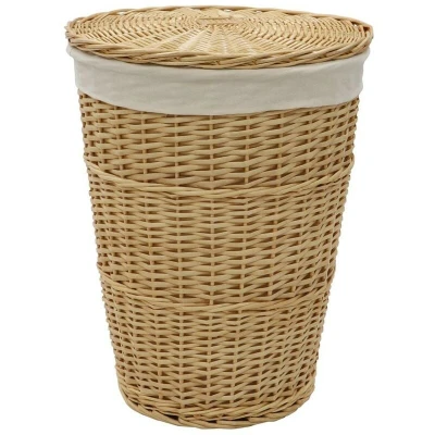 General description This beautiful Acacia Round Laundry Basket with Lid, finished in honey, is a perfect addition to any home. Handmade and woven from willow, it offers a traditional feel while seamlessly fitting into modern spaces. Its round, lined design makes it ideal for use in the bathroom, laundry/utility room, or bedroom. The basket's neutral tones and strength complement various interior styles, making it a versatile choice for your home. Technical specifications Dimensions: H: 57 cm x Dia: 46 cm approx. Capacity: 65 liters approx. Usage Ideal for holding a family wash load. Perfect for hiding away dirty laundry and minimizing odors. Other information The natural-colored lining features bows and is removable for easy machine washing at 30 degrees C. Willow is a rapidly renewable material, making this basket an eco-friendly choice.