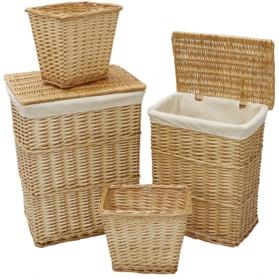 General description This beautiful set of four handmade willow laundry baskets and bins is perfect for use around the home. The traditional woven design in a honey finish allows it to complement both modern and traditional interior styles. The rectangular lined laundry baskets come in medium and large sizes, making them ideal for the bathroom, laundry/utility room, or bedroom. The accompanying bins can be used alongside the baskets or as standalone pieces in any room, such as the office or playroom. Willow is a rapidly renewable material, and our artisans use these raw fibers to handcraft the woven baskets, ensuring strength and durability. Technical specifications Large Laundry Basket: H: 57 cm x W: 45 cm x D: 32 cm Large Laundry Capacity: 78 l Medium Laundry Basket: H: 48 cm x W: 38 cm x D: 25 cm Medium Laundry Capacity: 43 l Waste Paper Bins (x2): H: 25 cm x W: 30 cm x D: 20 cm Waste Paper Bins Capacity: 11 l Usage Perfect for storing dirty laundry and hiding away any odors with