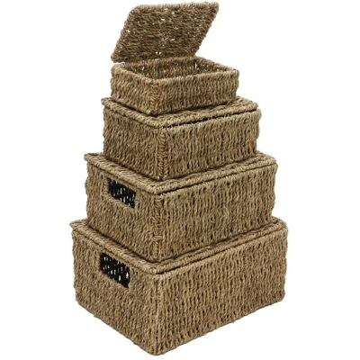 JVL Hand Woven Seagrass Set of 4, Rectangular Lidded Storage Baskets