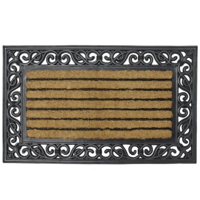 General description Our Karina Heavy Duty Rubber Coir Doormat is a stylish and functional addition to your entrance. This rectangular doormat fits snugly against your door, offering a modern twist on traditional designs. Made from 100% natural coconut fibres, the coir is set within a robust rubber frame, ensuring durability and longevity. The embossed detail filled with rubber adds a unique contrasting design, while the coir effectively scrapes mud and absorbs water, keeping your floors cleaner for longer. Suitable for all weather conditions, this doormat can be used outdoors at your door, porch, greenhouse, shed, conservatory, or patios, making it ideal for busy households. Technical specifications Material: 100% natural coir (coconut fibres) with a rubber frame Dimensions: 45x75cm approx. Usage Ideal for outdoor use at entrances, porches, greenhouses, sheds, conservatories, or patios Easy to clean by shaking or brushing to maintain the pile surface Other information Please note,