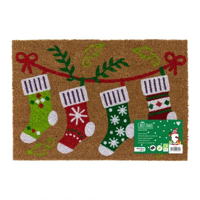 General description JVL’s latex Christmas coir mats are designed for durability, functionality, and sustainability. Crafted from 100% natural coir and natural latex, this mat utilizes renewable resources to deliver premium quality. The festive 'Stockings’ design adds a novelty touch, making it a charming addition to your home. Technical specifications Dimensions: 40x58 cm Material: 100% natural coir and natural latex Usage Ideal for use at the door or porch Offers excellent scraping and absorbs water, helping to keep floors cleaner for longer Other information 100% biodegradable: natural coir disintegrates within a year, while the latex backing breaks down within five years, depending on soil conditions