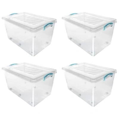 JVL Plastic Clip Lidded Storage Box with Wheels, Stackable and Nestable, Clear, Set of 4, 50L