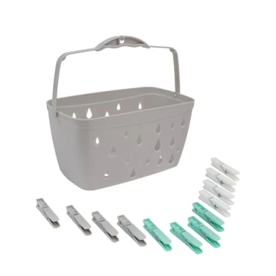 36 strong hold plastic pegs in assorted colours; white, grey and aqua Each peg is shaped with grooves for a better grip when hanging out your washing Use on all types of clothing – our strong pegs are designed to hold all types of laundry items from undergarments, children’s clothes to larger items such as bed linen, towels and more Multi-use – get crafty and use the pegs for hanging photo’s, holding paperwork together in the office, closing a bag in the kitchen and more Features holes so any excess water can drain out should you forget to take your pegs indoors and allows the air to circulate through Built-in hook-on handle to allow it to attach to most washing lines Peg Size: H:7 x W:1 x D:1.4cm approx. Basket Size: H:11 x W:23 x D:12cm approx. (height including handle upright 21cm approx.)