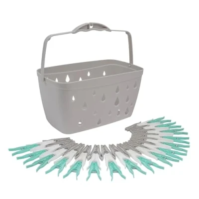 48 strong hold plastic pegs in assorted colours; white, grey and aqua Each peg is shaped with grooves for a better grip when hanging out your washing Use on all types of clothing – our strong pegs are designed to hold all types of laundry items from undergarments, children’s clothes to larger items such as bed linen, towels and more Multi-use – get crafty and use the pegs for hanging photo’s, holding paperwork together in the office, closing a bag in the kitchen and more Features holes so any excess water can drain out should you forget to take your pegs indoors and allows the air to circulate through Built-in hook-on handle to allow it to attach to most washing lines Peg Size: H:9 x W:1 x D:4cm approx. Basket Size: H:11 x W:23 x D:12cm approx. (height including handle upright 21cm approx.)