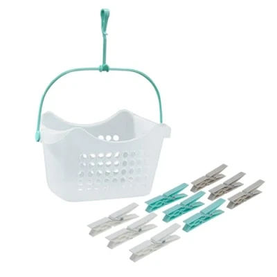 36 strong hold plastic pegs in assorted colours; white, grey and aqua Each peg is shaped with grooves for a better grip when hanging out your washing Use on all types of clothing – our strong pegs are designed to hold all types of laundry items from undergarments, children’s clothes to larger items such as bed linen, towels and more Multi-use – get crafty and use the pegs for hanging photo’s, holding paperwork together in the office, closing a bag in the kitchen and more Features holes so any excess water can drain out should you forget to take your pegs indoors and allows the air to circulate through Built-in hook-on handle to allow it to attach to most washing lines Peg Size: H:9.8 x W:1.2 x D:2.4cm approx. Basket Size: H:13 x W:23 x D:15.5cm approx. (height including handle upright 30cm approx.)