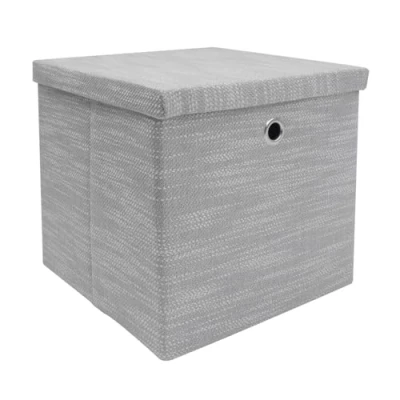 A square storage box with lids to keep your home tidy and clutter free Reflects our woven heritage and features a striking fabric in muted light grey tones, creating a linear pattern effect Designed to complement most interior décor and can be used around the home Our fabric storage box is so versatile, they make great storage solutions and can be used for a whole host of things Declutter and use them for jewellery, toiletries, stationery, small garments, make up, baby’s accessories and more Organise the home and use to store clothing in your drawers or simply a decorative feature in the home An attractive closed storage box with lid and circular chrome effect handle hole detail that adds that finishing touch. It can be used for storing bits and pieces around the home such as in a bedroom, living room, office, playroom and utility room. When not in use simply folds away to save on space. Size: H:28 x W:30 x D:30cm Capacity 22.7L approx