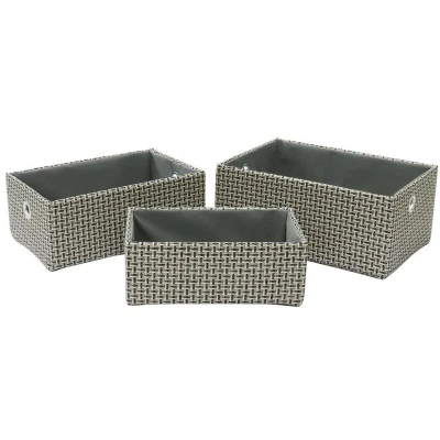 General description Our Silva storage collection reflects our woven heritage with a striking basket weave fabric in muted grey tones, creating a dog tooth effect, ideal for any interior decor. These versatile storage baskets are perfect for small garments, jewellery, makeup, toys, towels, linens, baby products, and more. They can be used in various areas of the home, including bedrooms, living rooms, playrooms, utility rooms, and children's bedrooms. The attractive open design makes them suitable for open units and wardrobes, and they can also fit inside some drawers for organizing clothes. Technical specifications Large: H: 14 cm x W: 32 cm x D: 22 cm, Capacity: 9.5 l Medium: H: 12 cm x W: 29 cm x D: 19 cm, Capacity: 6.5 l Small: H: 10 cm x W: 26 cm x D: 16 cm, Capacity: 4 l Other information Metal handles for easy carrying Can be stored inside each other when not in use