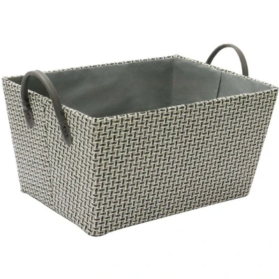 General description Our Silva storage collection reflects our woven heritage with a striking basket weave fabric in muted grey tones, creating a dog tooth effect, ideal for any interior decor. This tapered storage basket is designed to fit with your household decoration and is versatile for storing small garments, jewellery, makeup, toys, towels, linens, baby products, and more. It’s an attractive open storage box design suitable for open units or wardrobes for organizing clothes, as well as plenty more. Technical specifications Size: H:20 x W:38 x D:28 cm approx. Base: W:33 x D:23 cm approx. Capacity: 20.5 l approx. Usage Ideal for decluttering and organizing items around the home. Can be used in various rooms such as bedrooms, living rooms, playrooms, utility rooms, and children's bedrooms. Suitable for storing clothing, jewellery, toiletries, stationery, small garments, makeup, toys, towels, linens, and baby products. Other information Features practical PU handles for ease of